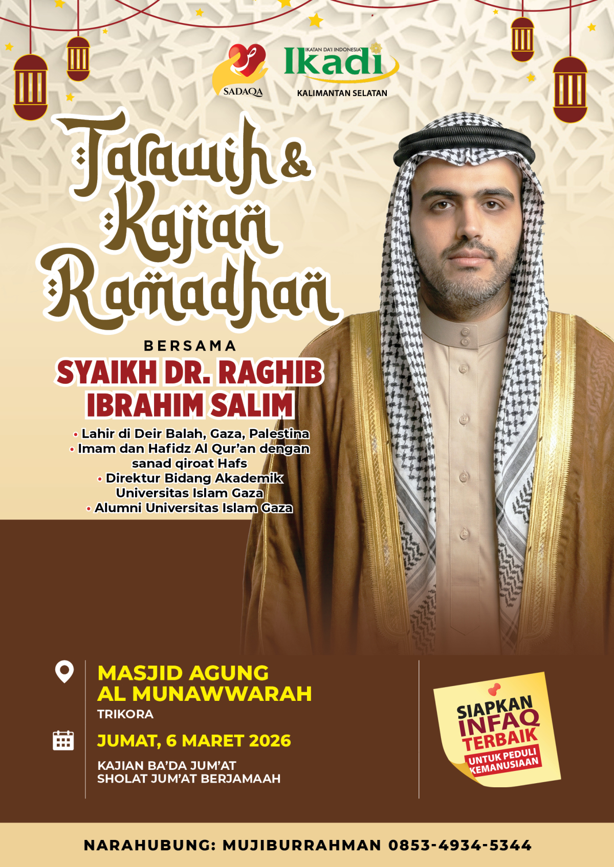 Ramadhan sebentar lagi datang, insya Allah penuh keberkahan dan kejutan kebaikan. Di momen istimewa ini, Sadaqa akan menghadirkan masyaikh Palestina untuk menjadi imam sholat sekaligus mengisi kajian di beberapa wilayah di Indonesia.